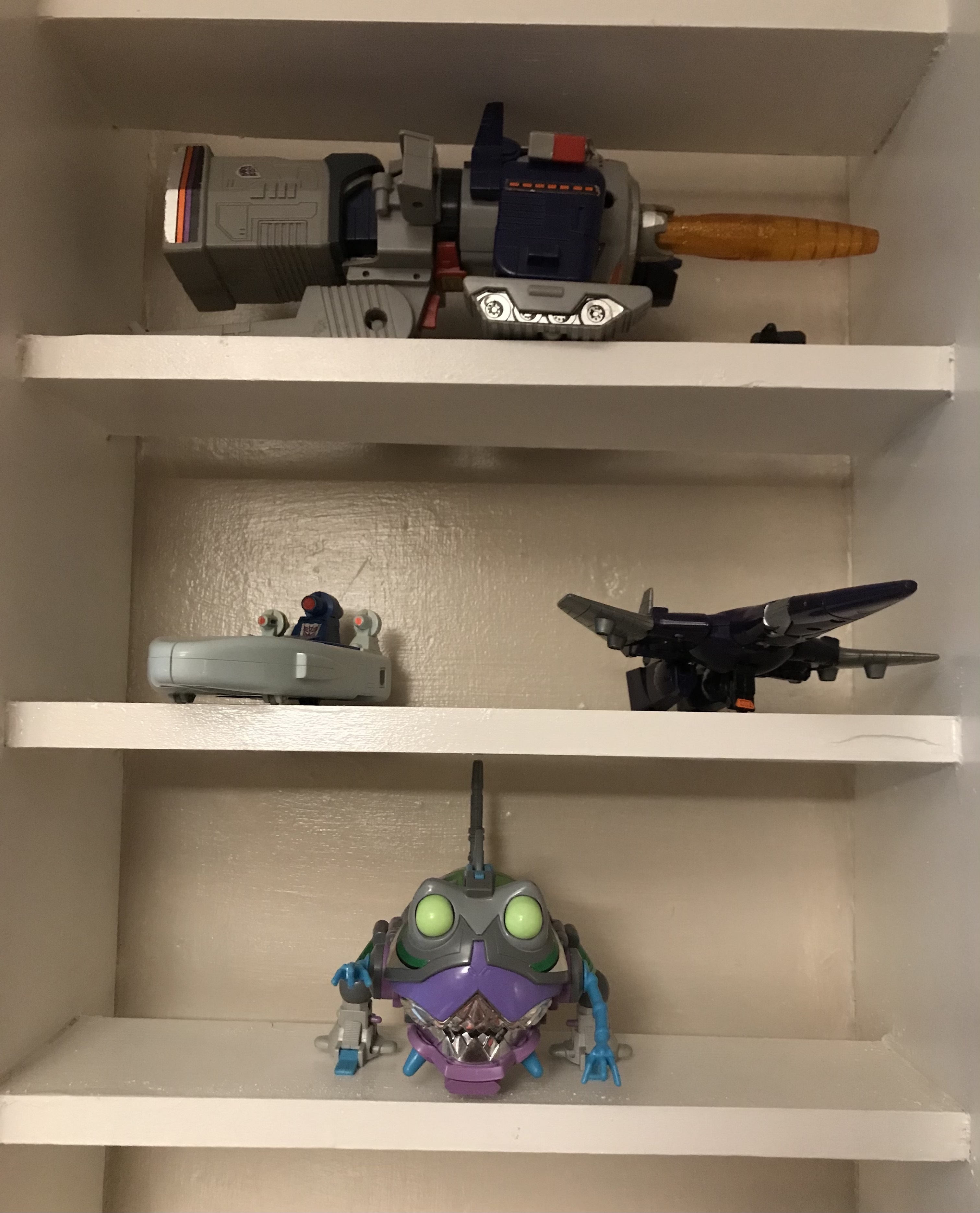 Earthrise Starscream is guarding the laptop on my bedtable. I always let figures be there for a while while SIEGE Optimus Prime is guarding my Playstation games in my shelf.