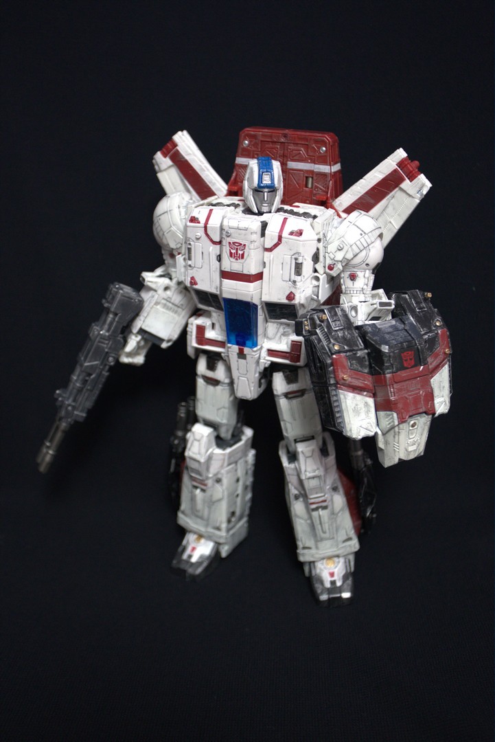 Love this mold. While the extra accessories are nice in bot mode, the way Hasbro designed them to stack everything at the top of the Fast-pack is non-sense. I also don't like the hollowness of the fuselage, so I attempted to cover it up as much as possible using the chest armor as the fuselage belly fairing. It's done by adding a (removable) 5mm rod in the back of the chest armor that can attach to the screw hole in the "belly button" of Jetfire. Added some plastic panels on the side of the chest that stick out a bit to hold the chest armor in place. This mod make this piece of accessory able to act as a shield instead of a chest armor, which I like better because the chin is obscured when the accessory is used a chest armor.
