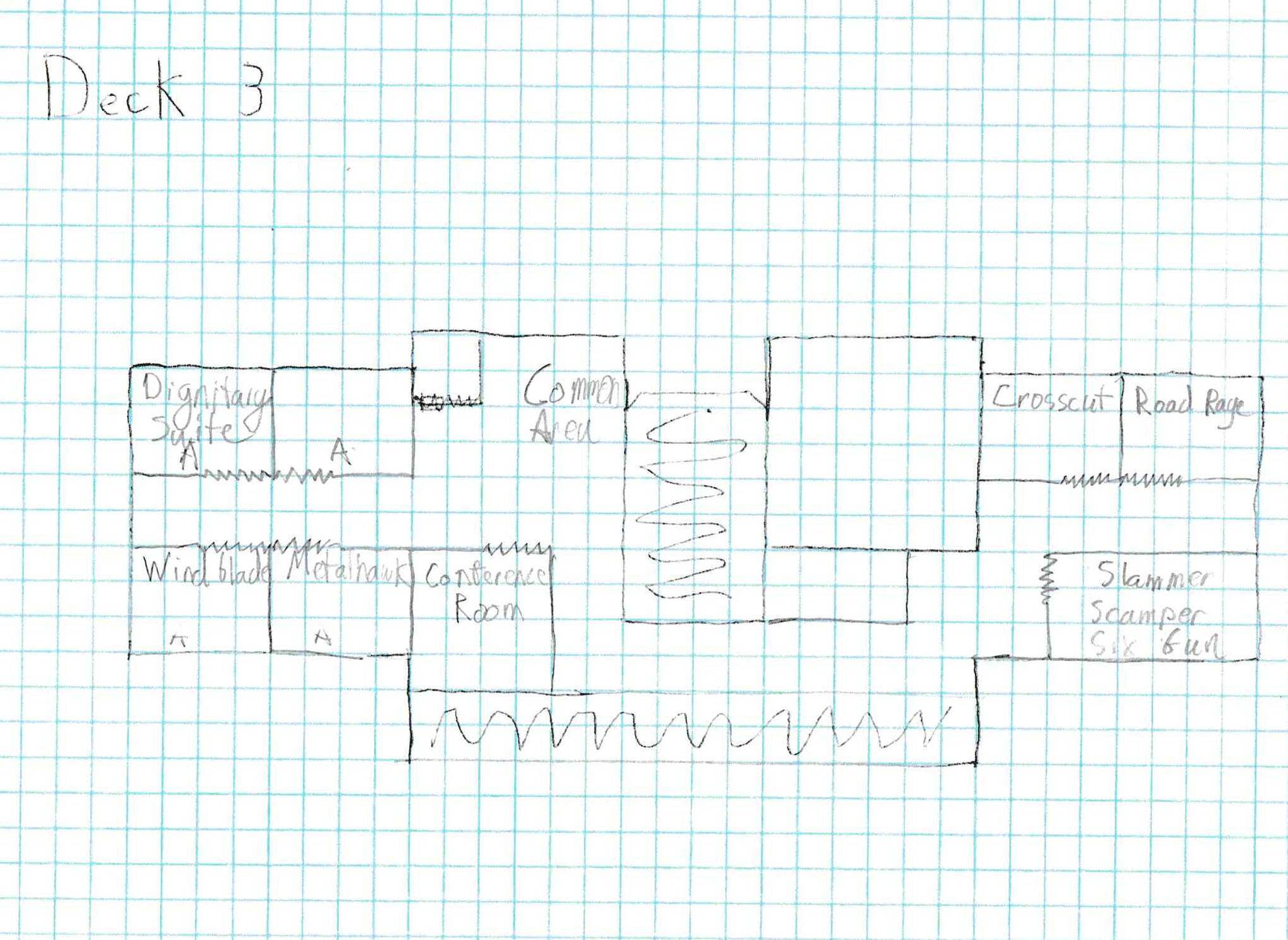 Much of Deck 7 is dominated by the Mess Hall/Common Area. This is probably a common place for Autobots to hang out, talk, play Cosmic versions of Poker, whathaveyou. I reserved space for whatwver passes as a Galley, against the Flight Elevator so that goodgrade supplies can be moved in bulk grom the Basement levrl. Givwn most Autobot fuels are drank, I dunno what this space entails, other than stprage of food grade fuels and Energon. My guess is its probably automated, but maybe Metroplex has a Foodie side and studies Mixology? Otherwise I had thought about using the character Spinout, since his arc is pretty much my experience in the food world (although in my case, the guys above me didnt so much die as had the good sense to leave.
