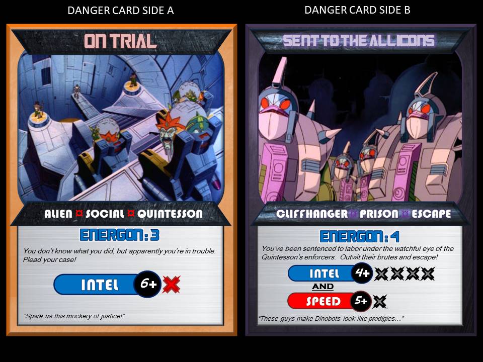 FINALLY, I’m totally open to help ‘filling out’ everything. I need to make an adventure list and an artifact list. I need to make a Gear list (epic upgrades pulled at random like the Star Saber) and a Common Items list (ordinary upgrades a player can purchase for different prices). An Allies list will be contingent on choices made above. An enemies list, with characters that both Autobots and Decepticons could reasonably fight, will also be helpful. The biggest things I’d need contributions for, though, is the Danger/Cliffhanger deck and the Event deck. These are the thickest decks in the game because they basically determine how much variety you experience, and that directly impacts how long you can play before the game becomes boring. I’ve made something like 60 custom Danger/Cliffhanger cards for Fortune and Glory, which I intend to get printed at some point to ‘reinvigorate’ our games at home.
