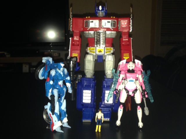 I bought the Hasbro Asia reissue of MP-10, thus allowing his 2012 Toys R Us counterpart to be condemned remain mint in same box. He's flanked by Arcee and Chromia, the former of which I have completely fallen in love with, backpack or no.