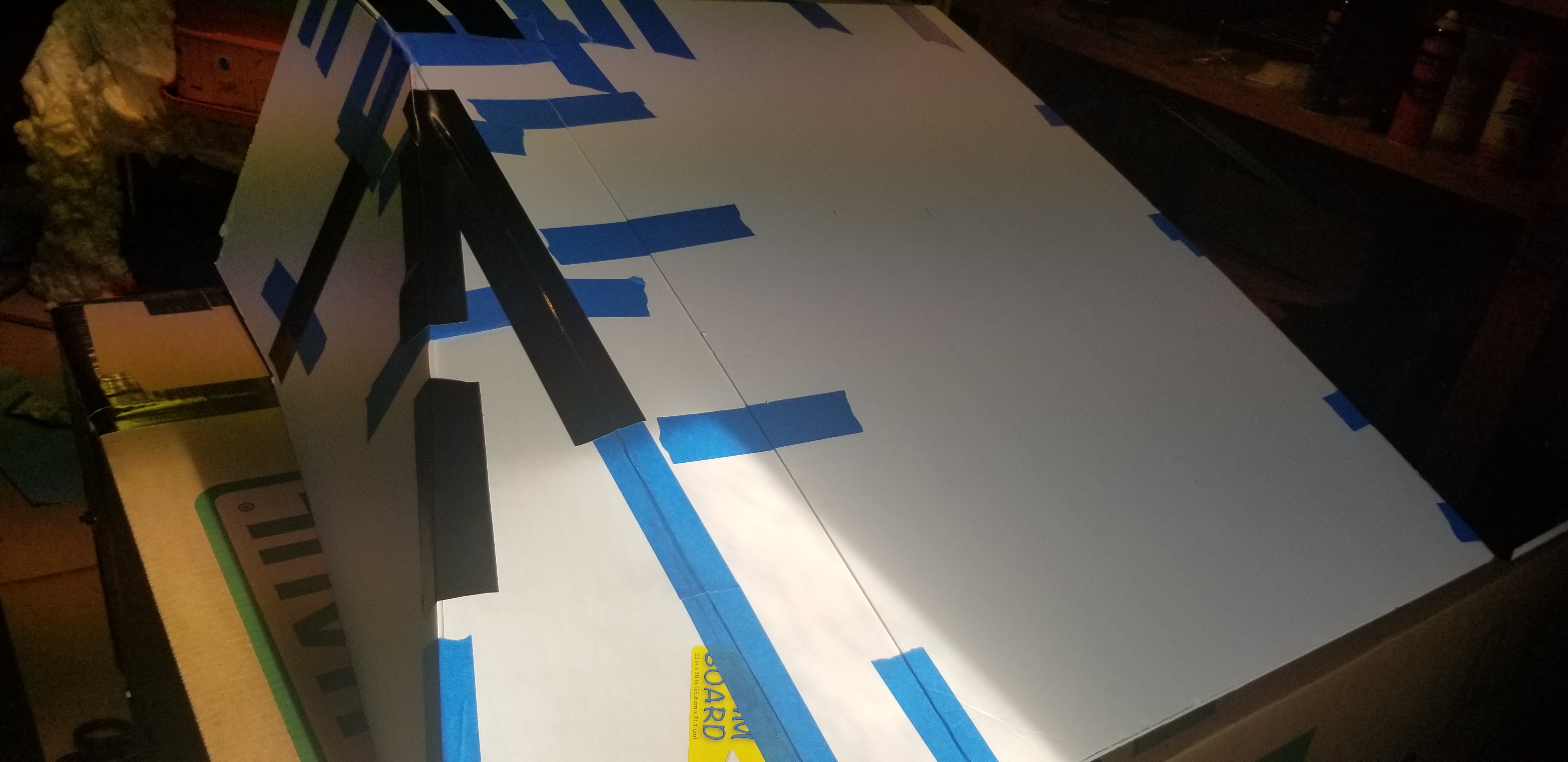 Got a little bit of building done this morning. I had originally thought about creating the walls in pieces, but I wanted something sturdier that was mostly all one piece. The closest thing I found on the cheap was a 48" longX21"highX24"wide cardboard wardrobe box at the local U-Haul for a couple dollars. The 48" length is perfect. Ideally I wanted the interior to be 24" high, but 21" is still plenty of ceiling height without feeling too cramped.