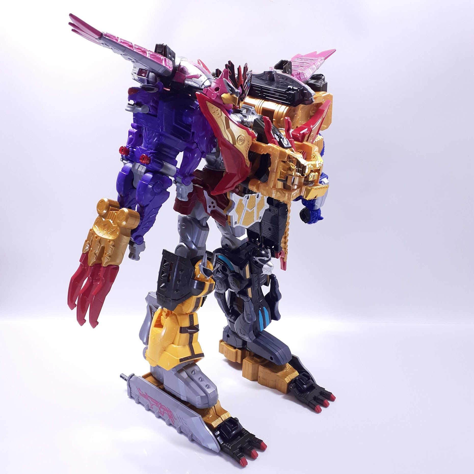 The other thing I've been buying is the Don Brothers DX "Zords". Don Onitaijin is a ridiculously fun and had some unprecedented articulation. Better hip joints and a flexible skirt would have been nice, but otherwise it's really cool! Also got Toradragonjin which is also very cool though not as articulated as the Onitaijin, the Don Robogoku (the gold dragon) is ridiculously long while the Don Robobolt (the purple tiger) is just short of having it's own bot mode, he even has a whole bot head of his own that gets mostly covered to form Toradragonjin. Combining Don Onitaijin with Don Robogoku and Don Robobolt results in your typical "Megazord" brick tower with no articulation, but it sure looks impressive .