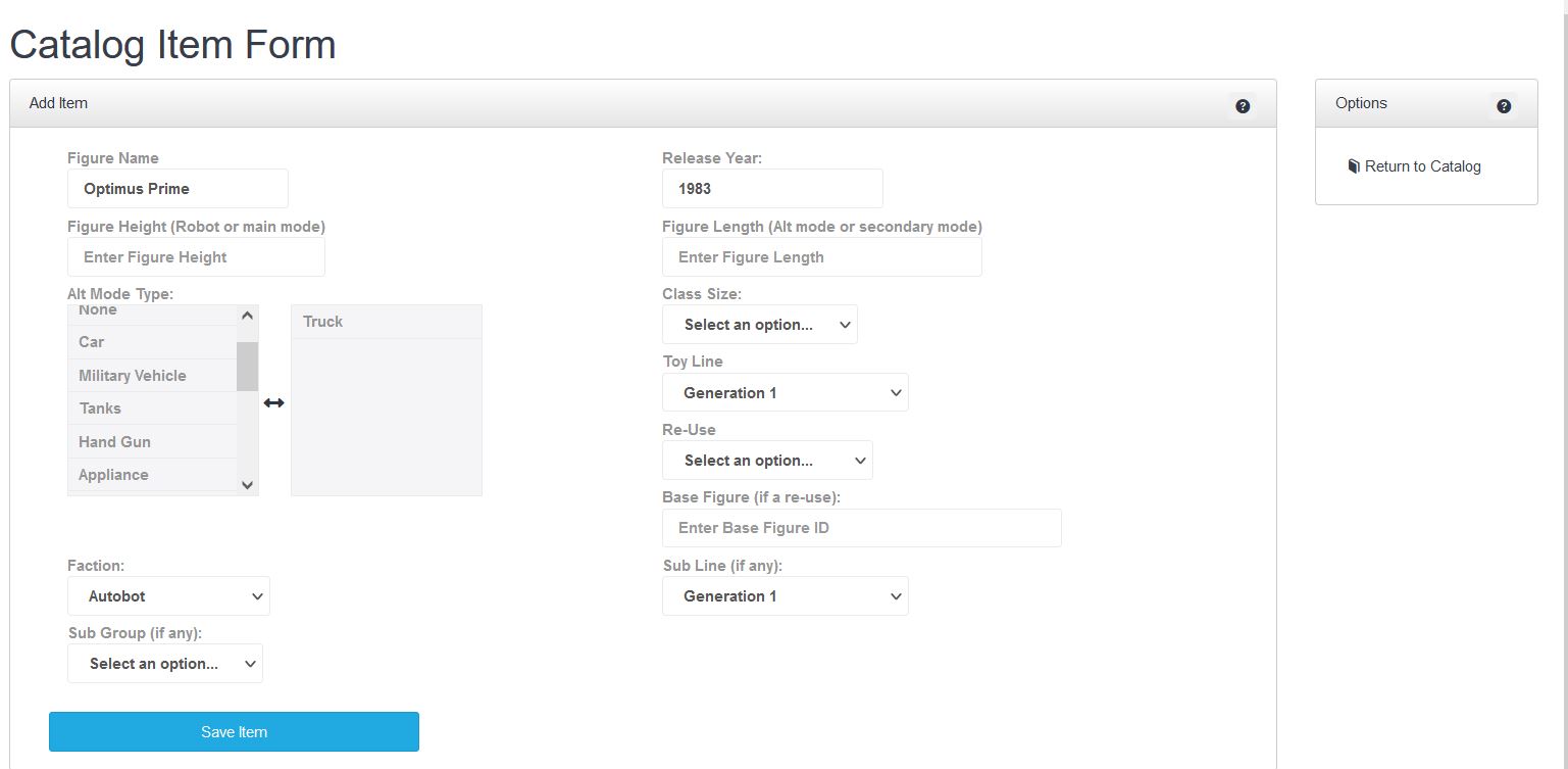 This is what I'm currently working on. The DB design and the management interface of all the data. Eventually I want it to be a sort of repository of Tf data that can be searched directly for information on the figures. I'm not going to be adding images, there's already a ton of sites that do that including Seibertron.com so there's no point in that. I'll likely just have links to galleries in those websites so you can navigate there and view them.