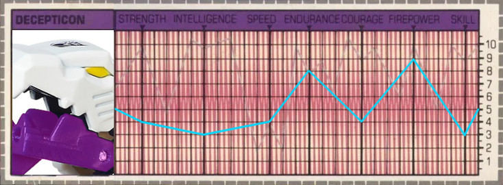 Abilities: In jet mode, Subject's top speed is Mach 3 for a maximum range of 4,500 miles consuming the least amount of fuel. Underside is an electrostatic battery that can store random electrons during flight, which Subject can release as a giant bolt of 150,000 volts of electricity. In robot mode, Subject's electrostatic discharger rifle has the same capabilities. One of the few Autobots who can fly as a robot.
