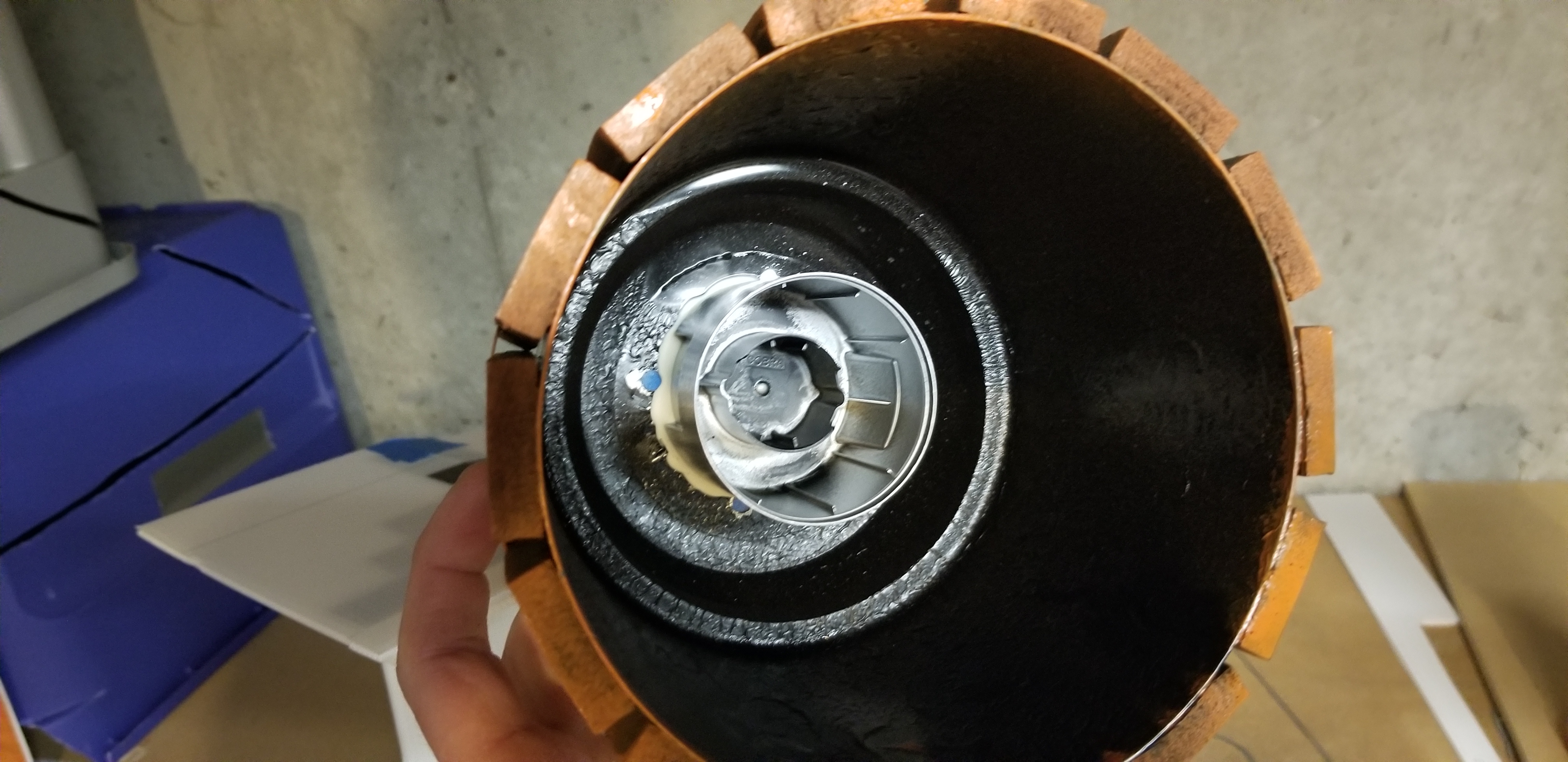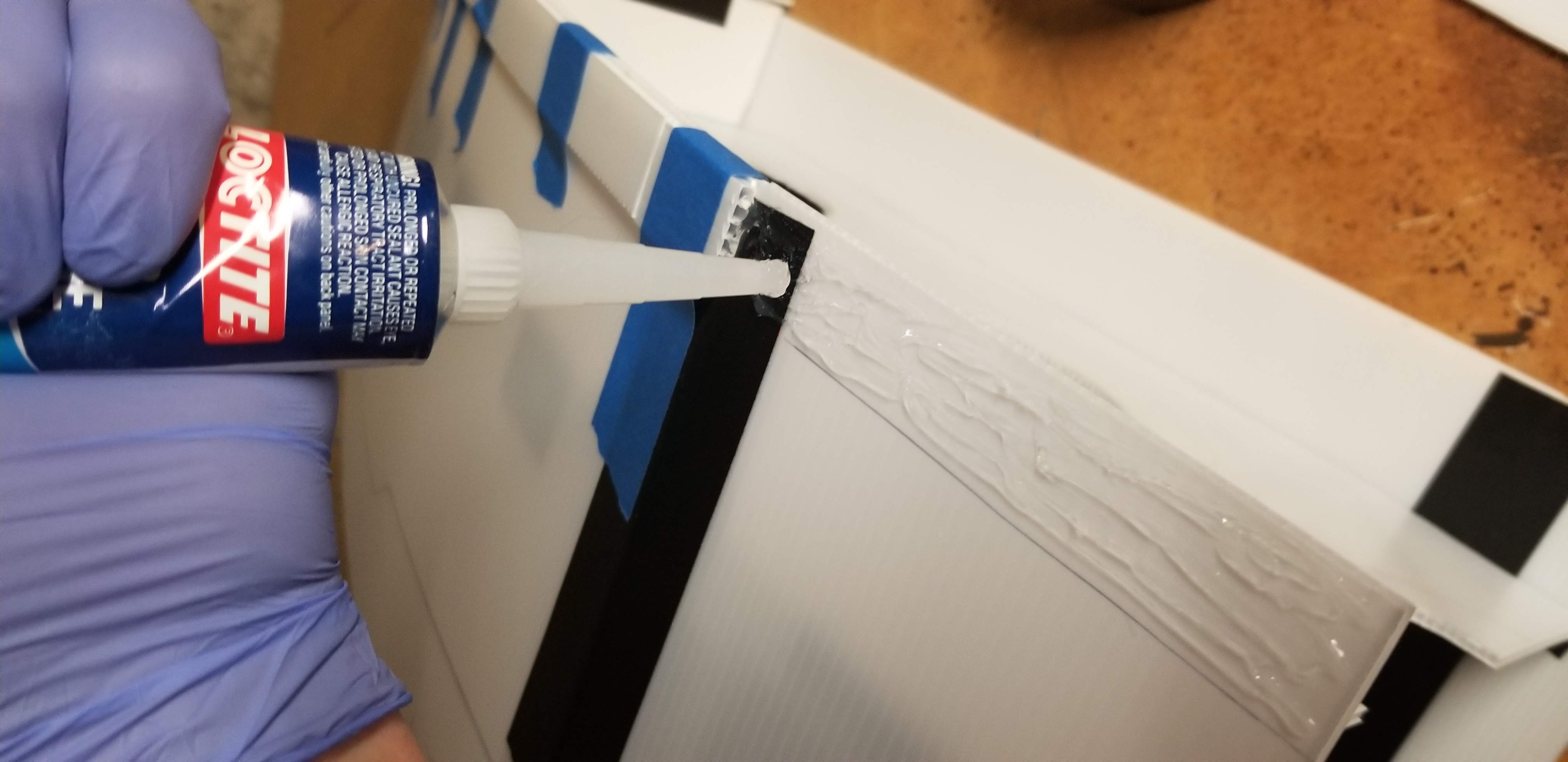 Next, I started drilling holes for the mini LED lights I picked up on sale. Then it was a matter of taping two of them together and using the gorilla tape to secure them in place.