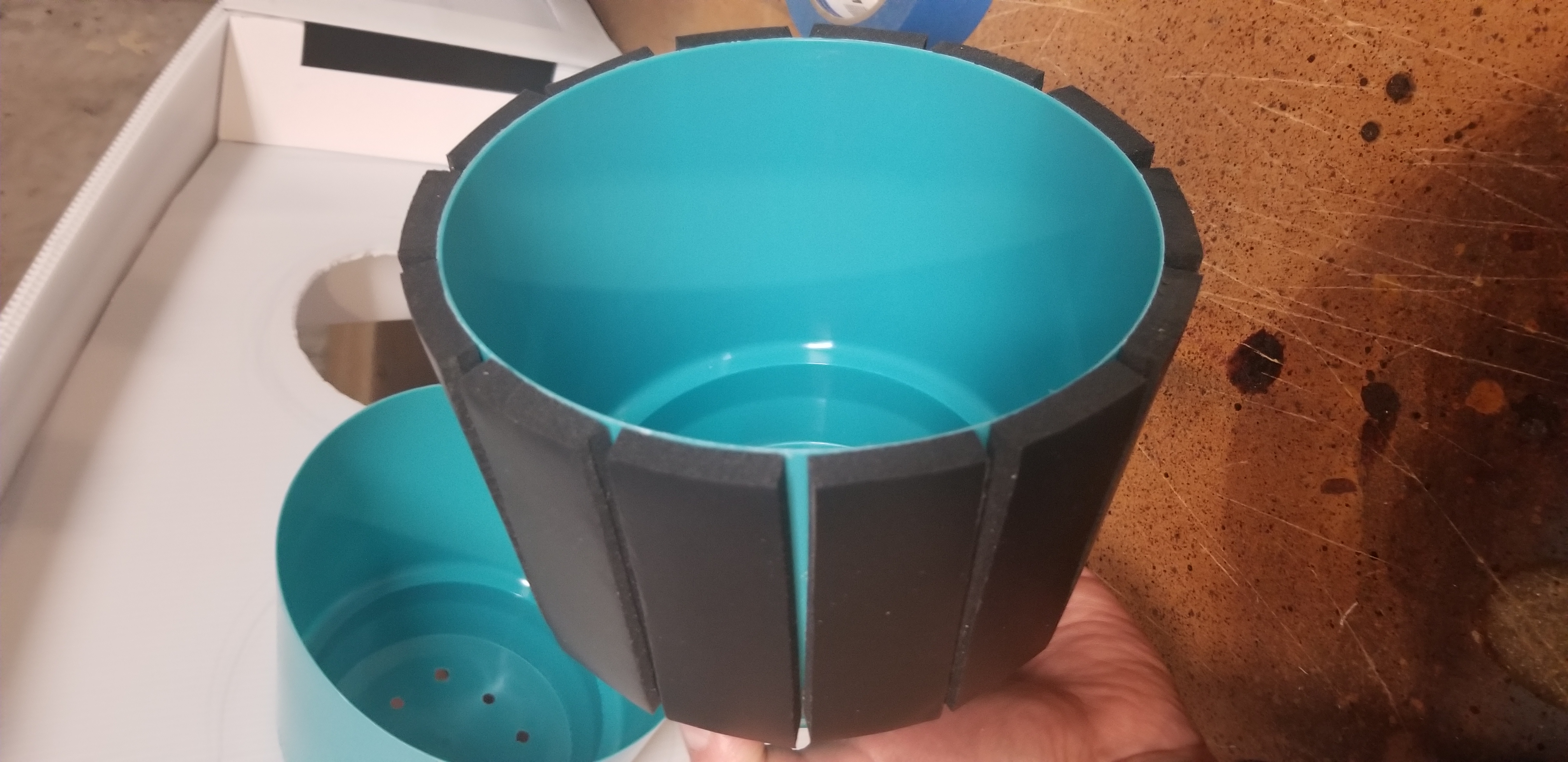 Last update for a few days. I drilled holes in the top rubber tote and secured it to the bottom two using a mix of adhesive epoxy and threaded screws with a fastening nut.