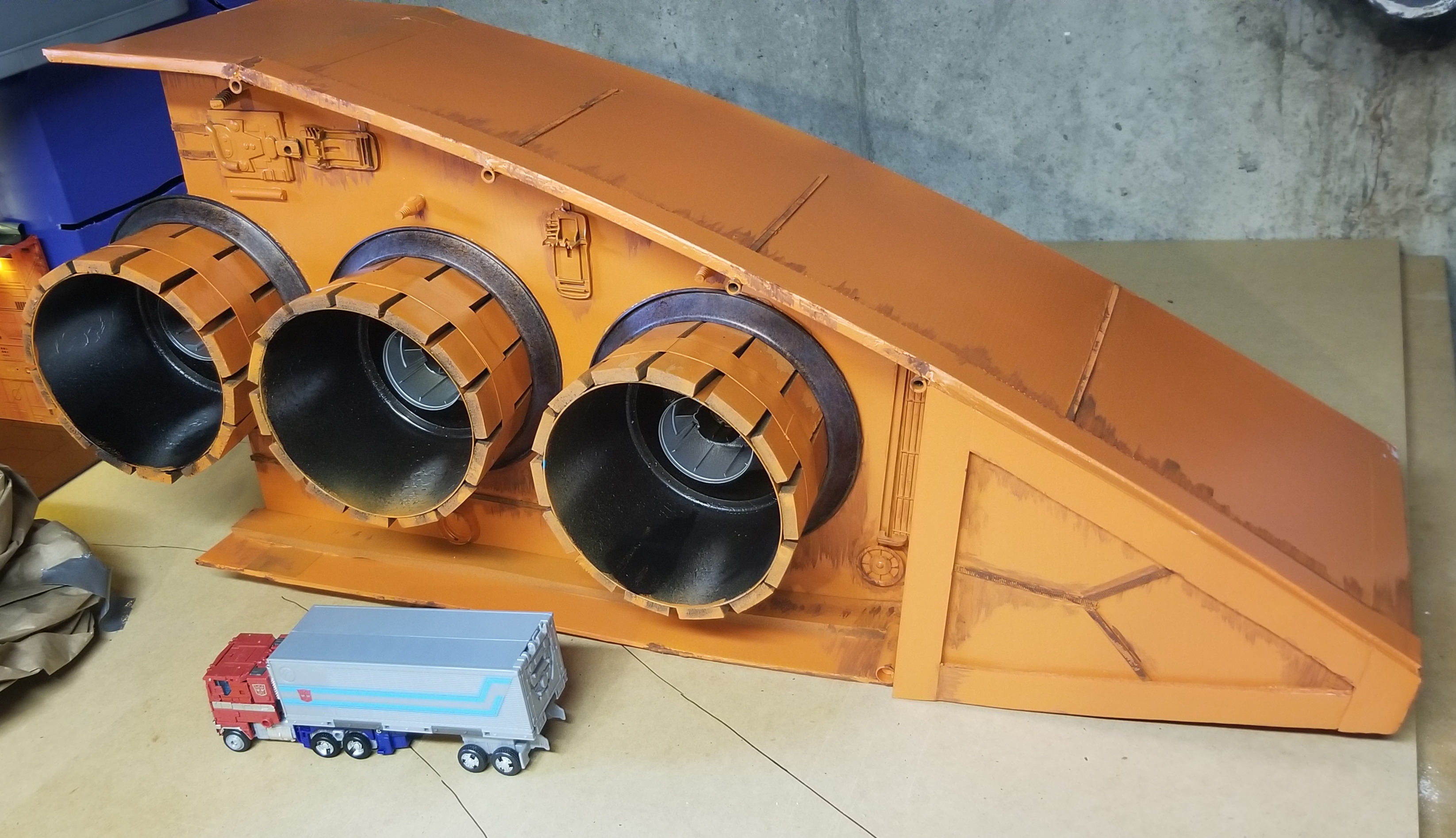 I finished the floor to the entrance tunnel. Once I spray painted it with the Metallic rust paint, I used a black sharpie marker to draw the random floor designs and then I spray painted a clear coat on top. I thought the clear coat was dry enough, so I used Loc-Tite spray glue to glue the entrance floor to the MDF diorama base. In my haste, I placed a few heavy gallon and half gallon size containers on the entrance floor to make sure there was no bowing upwards when the glue set...big mistake. The glue set and the entrance floor is now in place solid. The problem is the clear coat hadn't 100% dried and cured and what I put on it left impression "rings" that are clearly visible. I also kind of regret using the corrugated plastic board, since you can really see every ridge in the board. I'll chalk it up to the Autobots having to use scrap, inferior deckboard for their entrance floor. On the bright side, I know exactly what I'm going to use and how I'm going to do it when I get to the floors for the interior of the Ark. You live and learn.