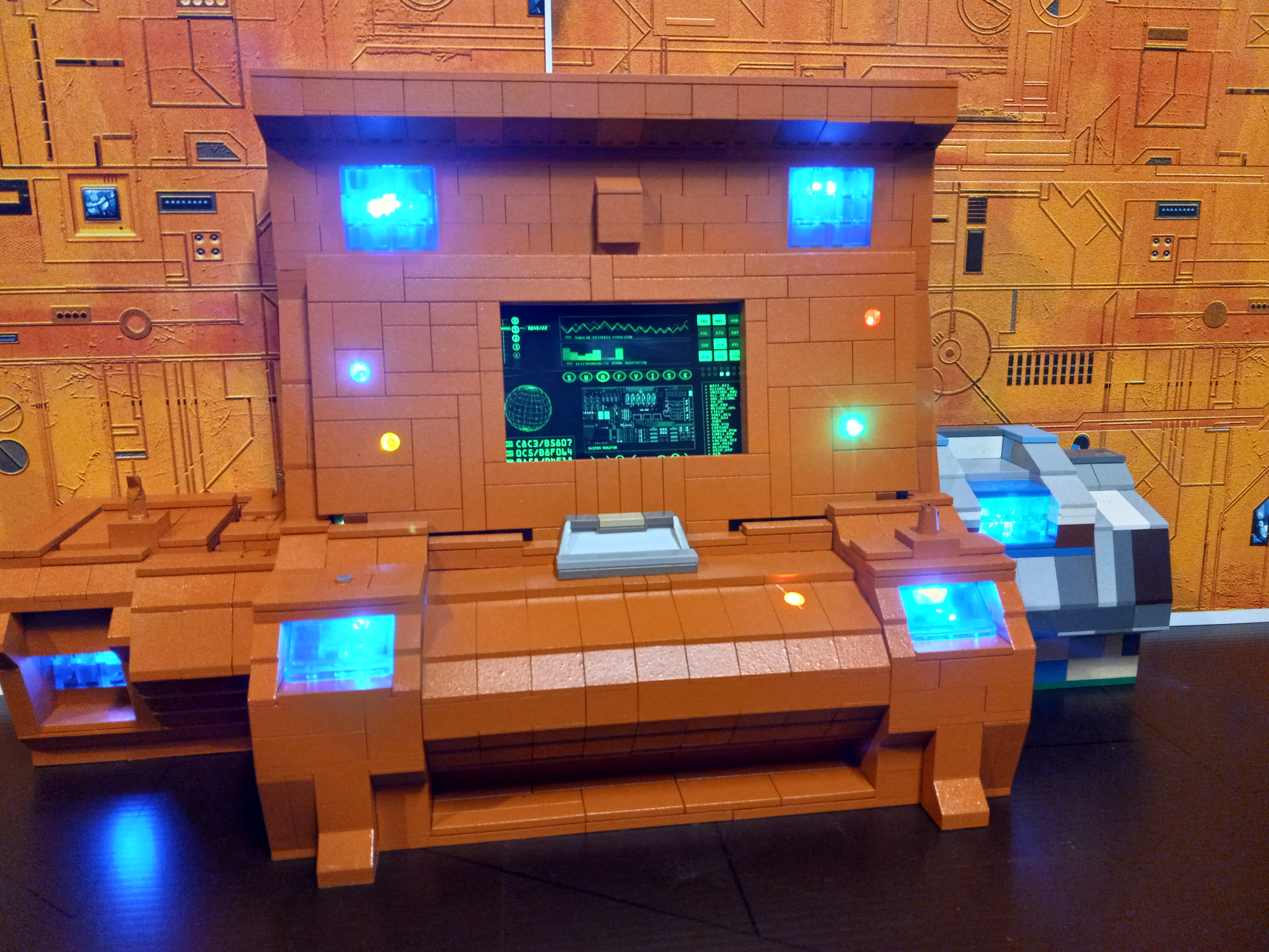 After I finished giving it the weathered paint and touches of silver, I glued a custom monitor screen to the right of the main screen, added the keyboards and the display above it.