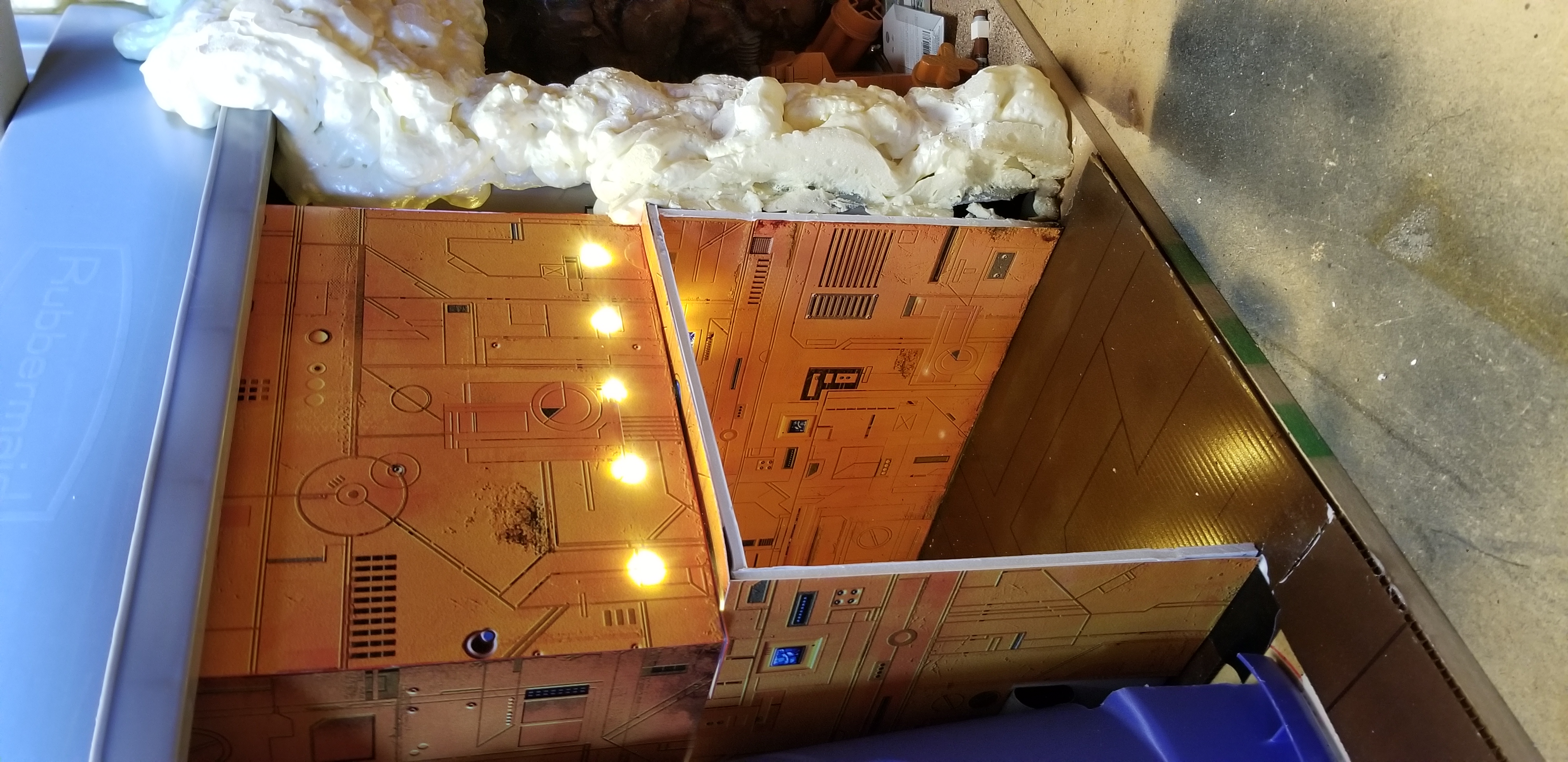 I just have to adjust a few corners and then use some extra foam I cut off of bigger pieces of the mountain I saved to fill in a few gaps. The cool part is the box is removable, in case I ever need to get to the lights.