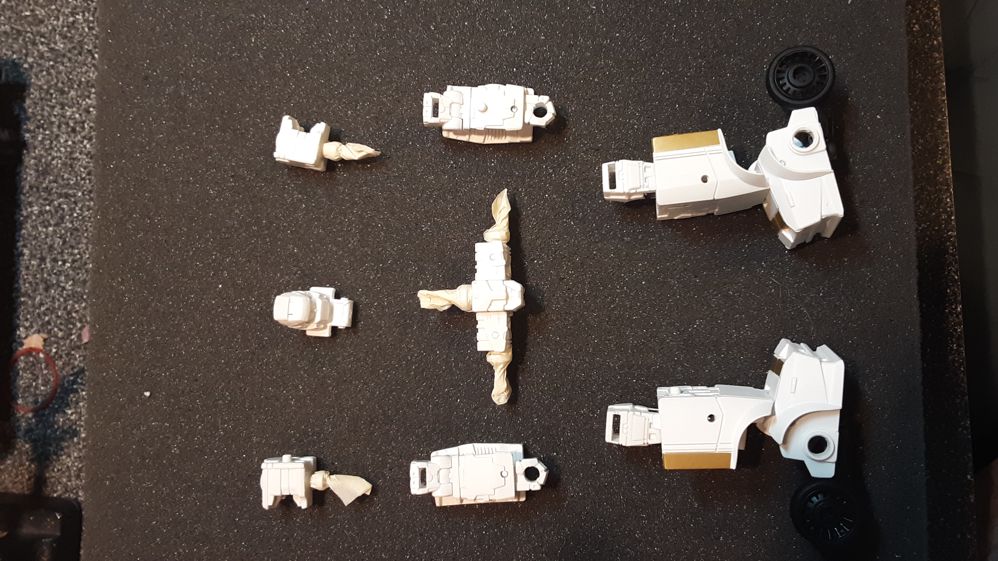 Taking him apart was fairly easy, as I didn't need to remove any pins, only mushroom swivels to isolate the limbs and head so they could all be spray painted. It was my first time spray painting a Transformer, but I knew that the best way to ensure the new colour stuck. I taped over the mushroom joints themselves so that they would still fit in their respective sockets; they don't clash since they aren't very visible anyway, and this way the joints are still functional and won't be ruined when put in use.
