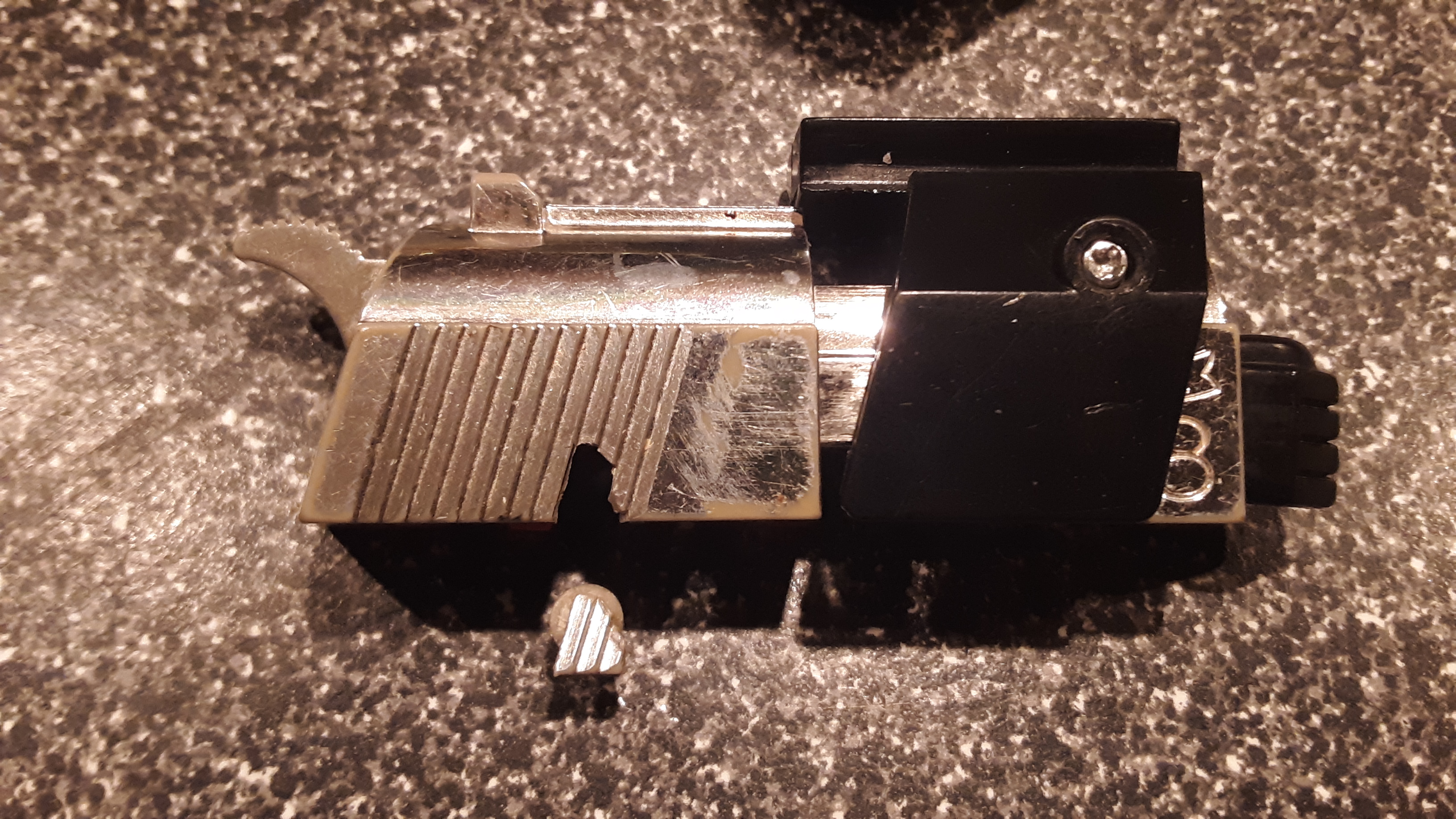 A G1 Megatron's right arm is challengingly rare on Ebay, but I finally found the arm and the cannon mount separately. I dug through the toolbox and found a screw that fit, and reunited the pieces.