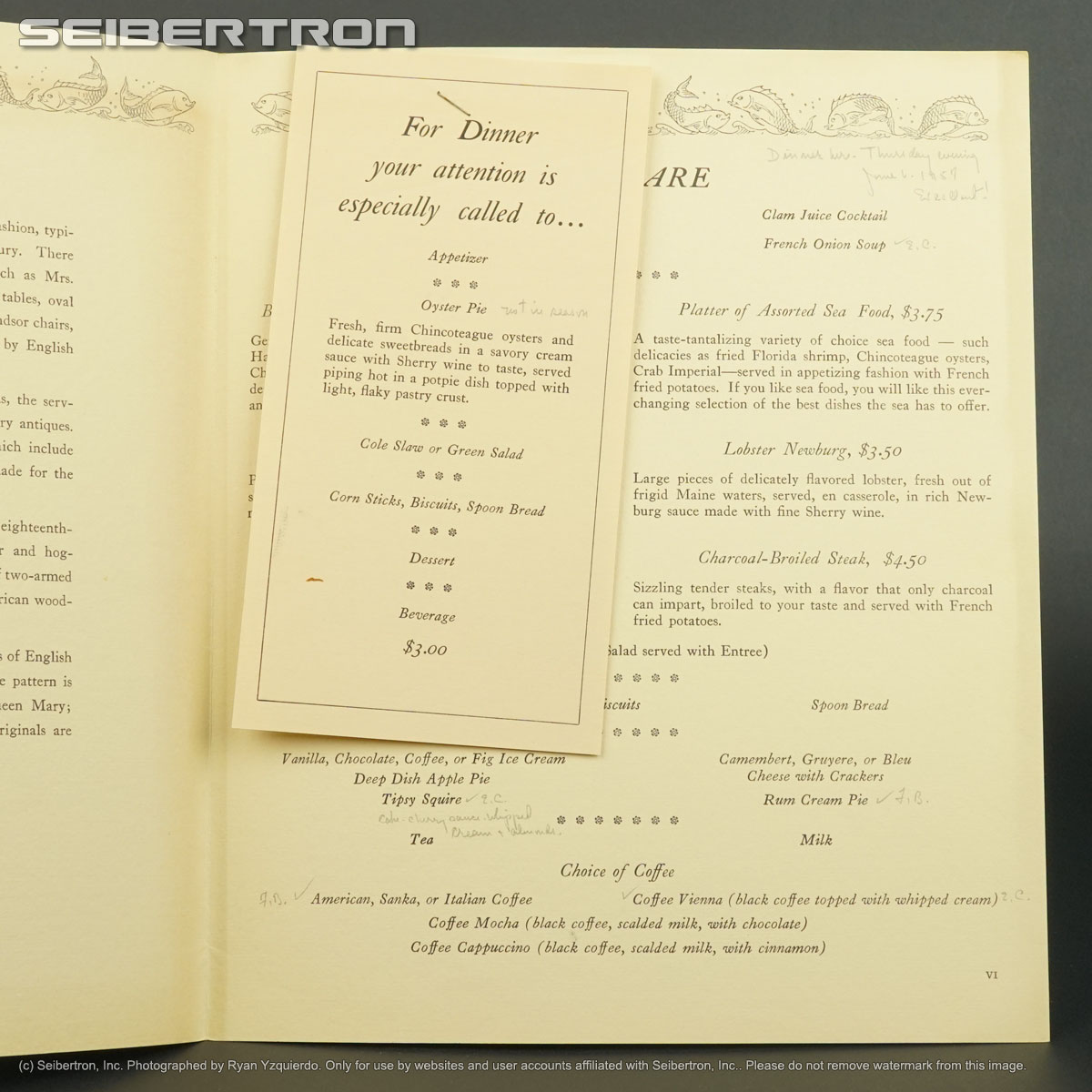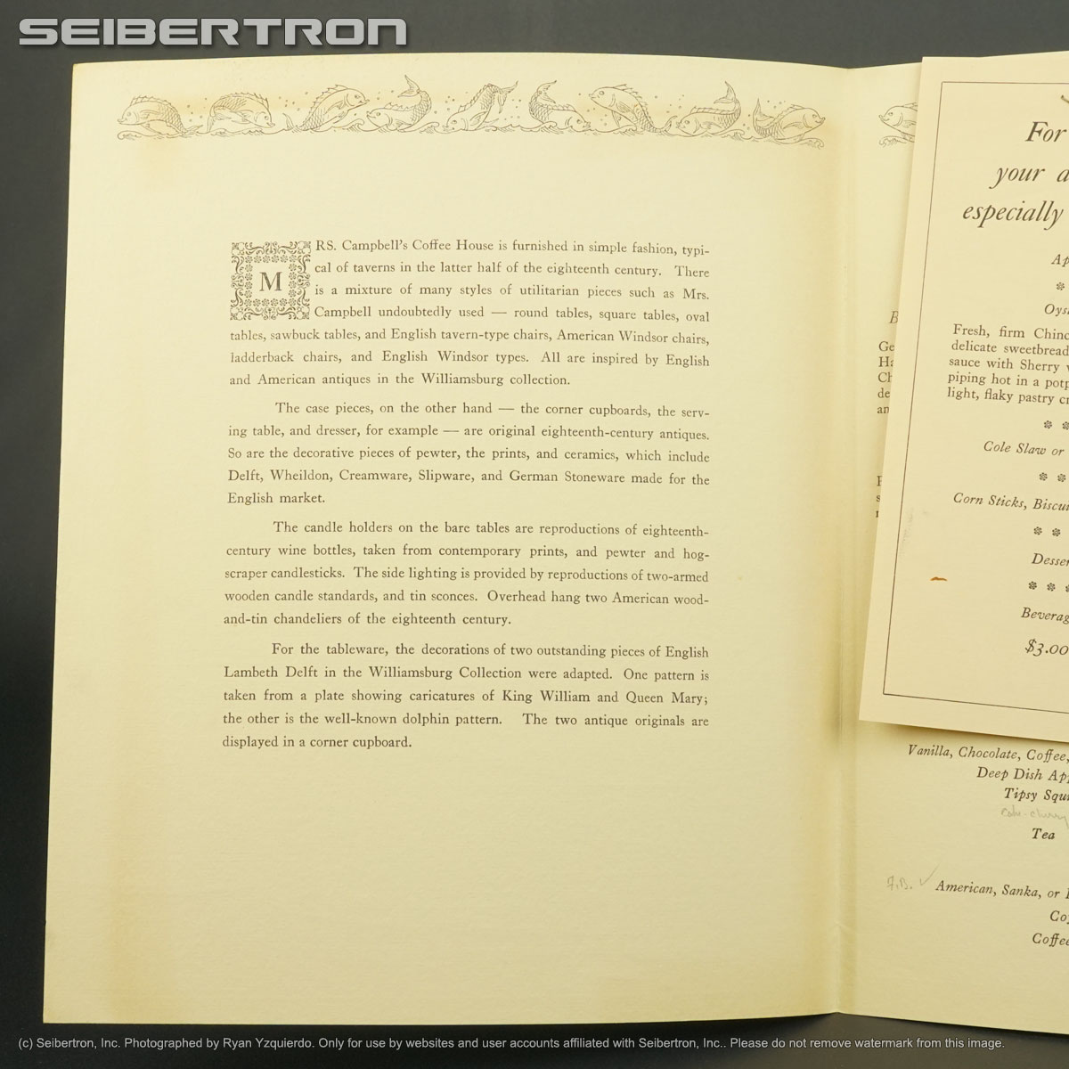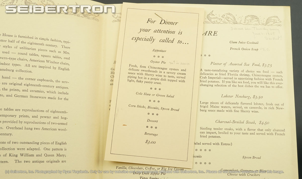 MRS CAMPBELLS COFFEE HOUSE SEAFOOD MENU + SPECIALS 1957 WILLIAMSBURG VA 240531D