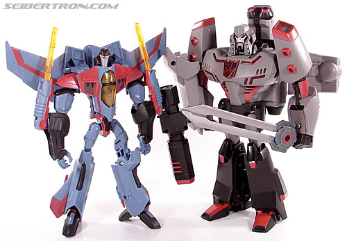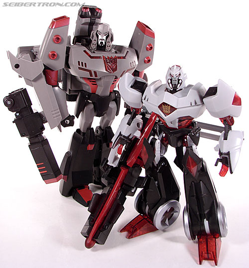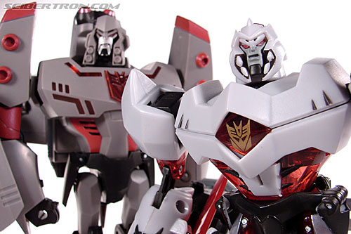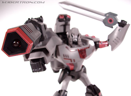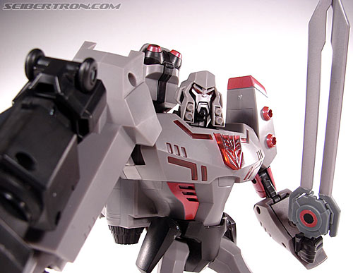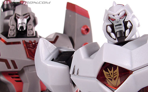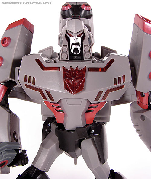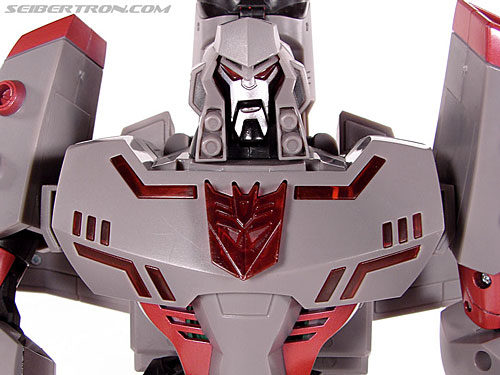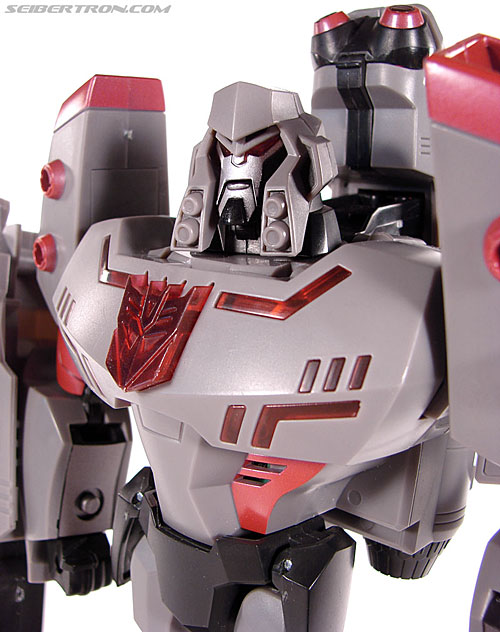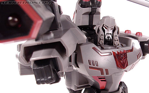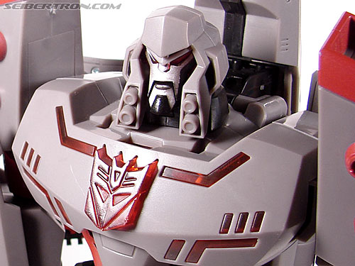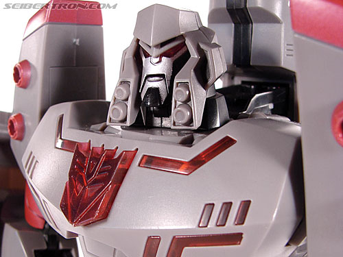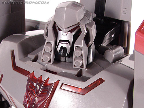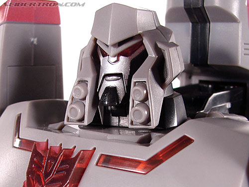 Megatron's head was positioned in some of the pictures by using one of the twisty ties from his packaging to force his head to stay in position like it is when you push the Decepticon symbol on his chest. The joy of photography!