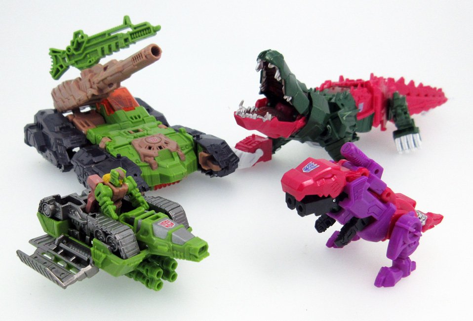 Skull meanwhile brings in his little buddy whom transforms into a bird and a little T-Rex. Hasbro is using the molds for their Crashbash AKA Squeezeplay and Clobber AKA Grimlock. Skull's little buddy uses the pinkish color that Skull has as well as some purple not found on Skull.