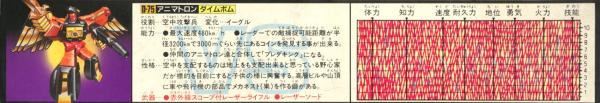 Abilities: Rocket thrusters mounted on his back allow Divebomb to achieve speeds of 300 mph when in eagle mode. He has a 2000 mile range and can reach an altitude of 18 miles. High resolution telescopic lenses within his optical modules enable him to spot a dime from 10,000 feet. He can lift a tank and tear through its armored skin with his beak. In robot mode he uses a particle beam rife with infrared sight and a laser guided sword, which is guided to its target after Divebomb first pinpoints the target with a laser beams that shoots from the sword's tip. Divebomb combines with his fellow Predacons to form the giant robot, Predaking.